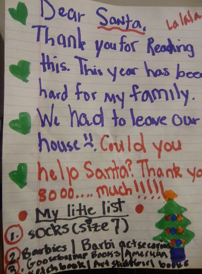 Eight-year-old Morgan wrote, "This year has been hard for my family. We had to leave our house. Could you help Santa?"